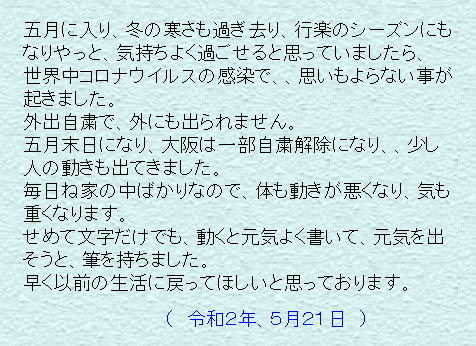 今年は新型コロナウイルスの感染が、世界中に広がっていて、これから先はどうなって行くのか心配で、毎日気分悪く過ごしております。